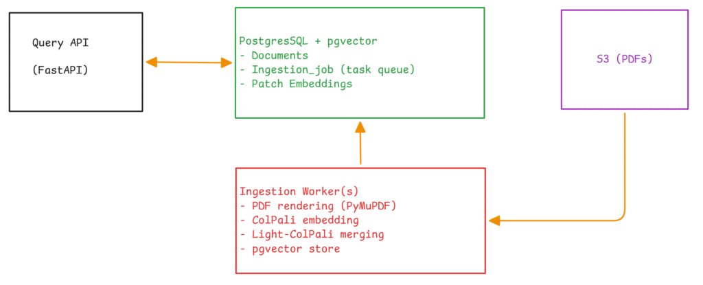 ColPali [1] and Light-ColPali [4] provide the core techniques. What we built is the production plumbing around them: a resilient ingestion pipeline with failure recovery and deduplication, a two-stage retrieval pipeline that bridges patch-level granularity with page-level result presentation, and the infrastructure choices (PostgreSQL as unified store, HNSW indexing, lease-based job coordination) that make the system deployable and operable.